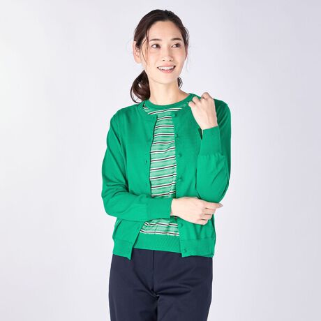 コットン混合生地を密に編み、高級感ある生地感のハイゲージニットカーディガン。左裾のブランドエンブレム刺繍がさりげなくおしゃれで上品なデザイン。エレガントなデザインのくるみボタン、袖先のスリットもスタイリッシュなデザインアクセント。シンプルなデザインで様々なアイテムにマッチする便利なアイテムです。