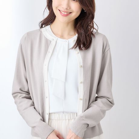 ・ややゆったりとしたシルエットの長袖クルーネックカーディガン。