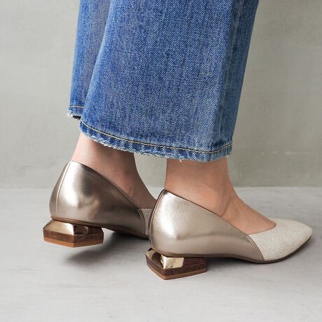 ウッドプリント×メッキのコントラストがモダンなデザインヒールもポイントです。スクエアトゥですっきり見えする大人な一足。