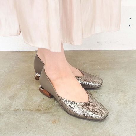 ウッドプリント×メッキのコントラストがモダンなデザインヒールもポイントです。スクエアトゥですっきり見えする大人な一足。