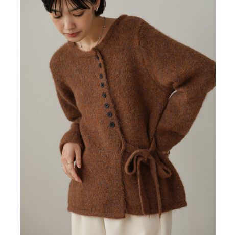 様々な色が絶妙に組み合わさったMIXニットがニュアンス感満載なカーディガン♪アクセントのブラックボタンがアイキャッチになります。左サイドにあしらわれたリボンでフェミニンさもUP!アシンメトリーのデザインがオシャレ感度を引き立たせてくれます。きもち長めの着丈も嬉しいポイントです。