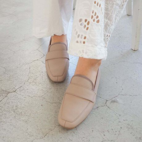 グログランリボンのパイピングがさりげないアクセントになった、フェミニンなソフトローファーです。