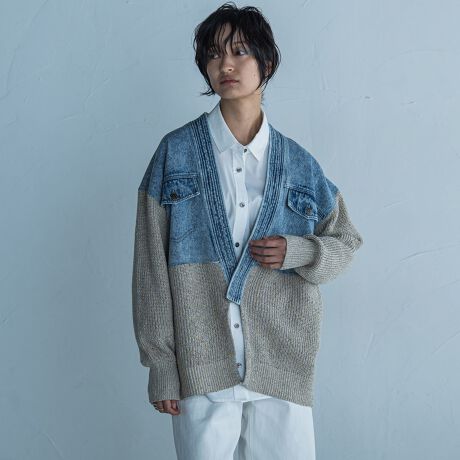 ジャケットライクなデニムドッキングデザインが目を惹く、ニットカーディガン。