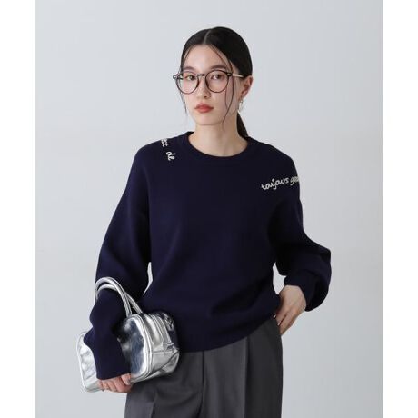 配色を効かせたロゴ刺しゅうがキャッチーなニット。肩まわりにあしらった、アシンメトリーなロゴ刺しゅうがコーディネートのアクセントになります。袖口と裾は長めに取ったリブ編みでおさまりが良く、裾はラフな雰囲気でブラウジングができ、アウトスタイルがしやすい仕上がりに。マニッシュなパンツ、デニムパンツ、フェミニンなナロースカートまで着回せます。