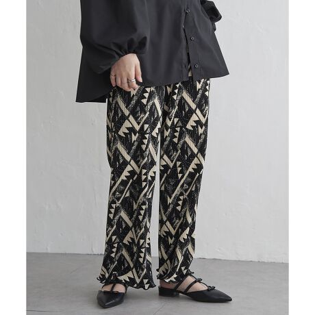 エスニックな雰囲気のプリントを揃えたスムースプリーツパンツ。