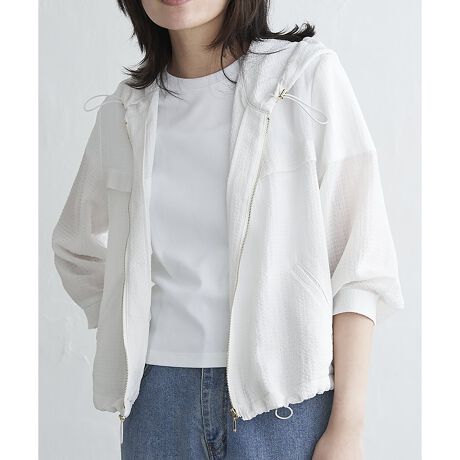 ポコポコとした立体感のあるシワ加工が特徴のシアーフードブルゾン。