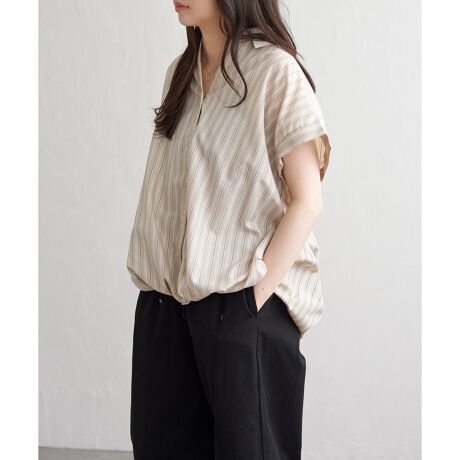 フロント裾に施したタックが、まるでトップスインしたかのような立体感を演出するストライプシャツ。