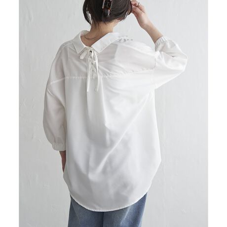裾にタックを施し、まるでトップスインしているようなこなれたシルエットを演出する5分袖シャツ。