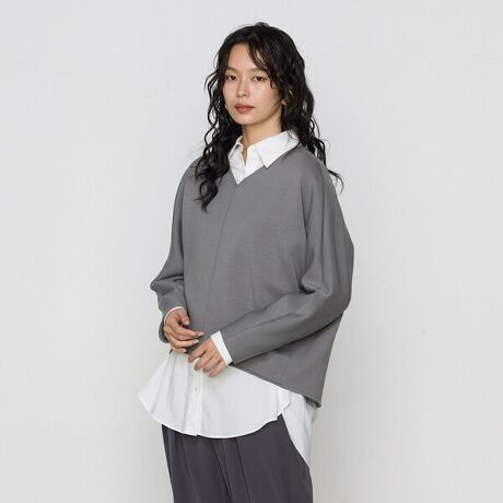 内側にレイヤードができるサイズ感にしていますが、春は1枚でもすっきり着れるVネックあきなので、長いシーズン着られます。