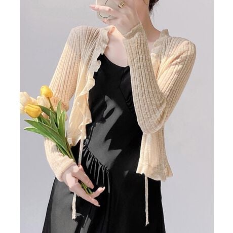 リボンで結ぶフロントデザインがフェミニンでエレガントな印象を演出します。透け感のある素材なので春夏の羽織りとして活躍し、ワンピースやキャミソールとの相性も抜群