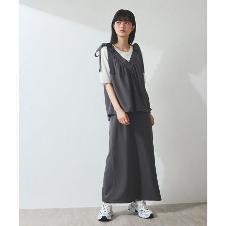 肩のリボンとフレアーギャザーがデザインポイントのセットアップライクなワンピース。