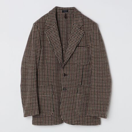 ガンクラブチェックのウールツイード生地で仕立てた、耐久性と重厚感、トラッドな表情が魅力です。