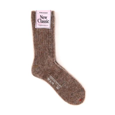 起毛加工を施したキッドモヘアの糸を使用したモヘアソックスです。編み地をあえてリブ編みにしているため、ふわふわな質感だけではなく、シャープな印象も感じさせます。糸が細く、見た目よりも薄手の仕上がりで、パンプスにも合わせていただけます。冬の暗くなりがちな足元のポイント使いに最適です