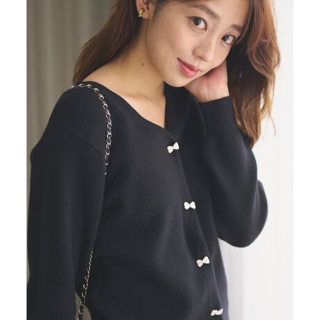すっきりとしたVネックは少し大人ぽい印象もプラスしてくれるので、リボン釦が甘すぎずお洒落な雰囲気に着て頂けます。