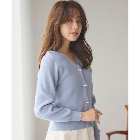 すっきりとしたVネックは少し大人ぽい印象もプラスしてくれるので、リボン釦が甘すぎずお洒落な雰囲気に着て頂けます。