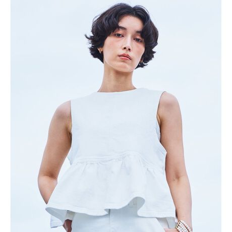 短めの丈感は、ワイドパンツとの相性が抜群。裾広がりのペプラムデザインは、パンツスタイルと合わせることで、メリハリのあるシルエットが完成します。カジュアルからきれいめまで、幅広いスタイリングに活躍します。