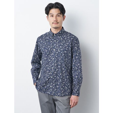 シンプルな花柄のボタンダウン長袖シャツ。60コットンローンがベースで、軽くしなやかな着心地が特徴。一輪の花が風に舞っている一瞬をとらえたような、静寂を感じる柄感で、爽やかな落ち着きのある色合いがコーディネートに取り入れやすい1着。