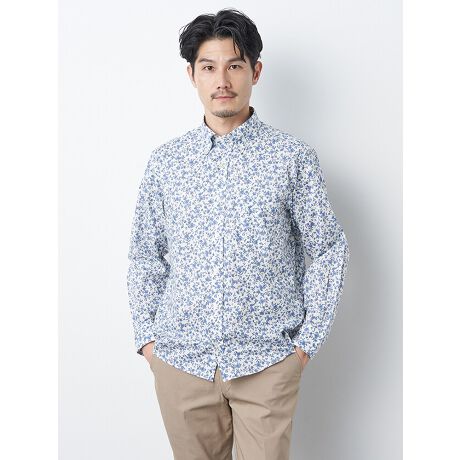 シンプルな花柄のボタンダウン長袖シャツ。60コットンローンがベースで、軽くしなやかな着心地が特徴。一輪の花が風に舞っている一瞬をとらえたような、静寂を感じる柄感で、爽やかな落ち着きのある色合いがコーディネートに取り入れやすい1着。