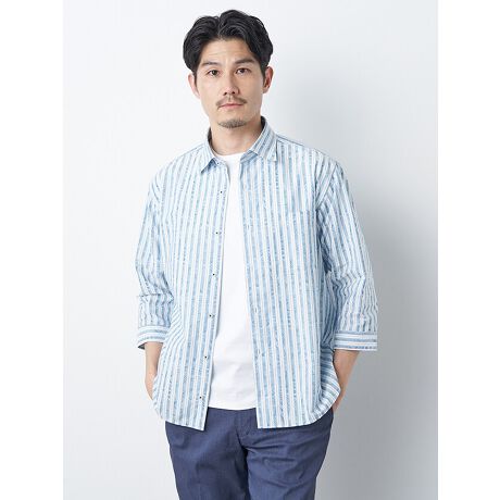 大胆なペイズリー柄をベースに、爽やかなストライプを施したジャカード織セミワイドカラー7分袖シャツ。春先から夏まで、軽い羽織としておすすめの1着。コットンポリエステル混紡糸使いで取り扱いも容易。