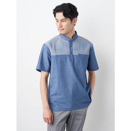 [型番:7204724]凹凸のあるブロック組織でボーダー柄を表現した半袖Tシャツ。衿はキーネックデザインに。肌触りが良く、夏場に活躍する1着。