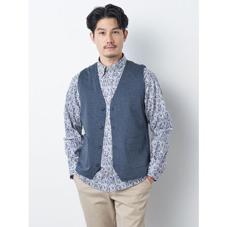 カットソー仕立ての撚り杢カノコベスト。通気性の良い鹿の子生地を採用し、ラフに羽織ることができるカジュアルなベスト。撚り杢糸を使用し、独特なMIXカラーを表現。春の少し肌寒い時や、夏場でもドレスアップしたい時に使える便利な1着。同素材ジャケットあり。2ピースとしても着用可能。