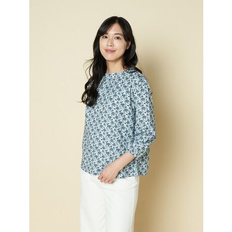 ハイゲージのやわらかな天竺綿100%にサラサプリントを載せました。衿元にさりげなく入ったギャザーがポイントです。後ろ衿をゴム仕様にして着用しやすい仕様になっています。ブルーのワントーンプリントが上品で爽やかな印象のカットソーです。