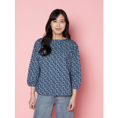 ハイゲージのやわらかな天竺綿100%にサラサプリントを載せました。衿元にさりげなく入ったギャザーがポイントです。後ろ衿をゴム仕様にして着用しやすい仕様になっています。ブルーのワントーンプリントが上品で爽やかな印象のカットソーです。