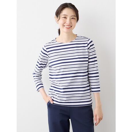 コットン100%の肌触りの良いボーダープルオーバーです。ボーダー柄の中に程よい透け感のレース柄を取り入れた特殊な作りになっています。主張しすぎない透け感がカジュアルな中にもフェミニンな印象を作ってくれます。