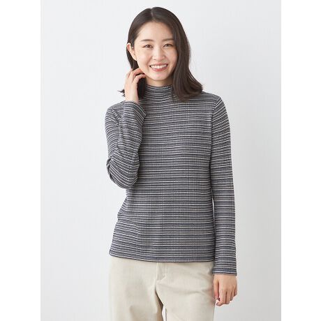 ウォーム感のあるランダムボーダーのテレコハイネックプルオーバー。動きのあるボーダーピッチがカジュアルすぎない落ち着いた雰囲気に。柔らかくてさらりとした生地が心地よく、寒さの残る季節から春にかけて長く着用いただける大活躍なカットソーです。