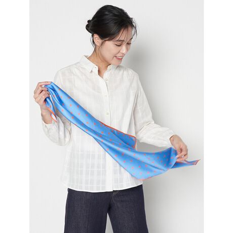 ドット柄のスカーフ。素材は軽やかで発色も綺麗なポリエステル100%です。ジーニングスタイルにも綺麗目コーディネートにも合う3色を用意しました。お出かけの時に気軽に持っていただけるコンパクトサイズは贈り物にも喜ばれるアイテムです。