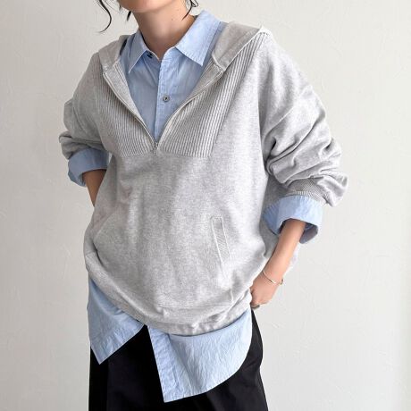 ・ZIPで胸元の開き具合を調節でき、ロゴTやハイネックなどとのレイヤードも楽しんでいただけます