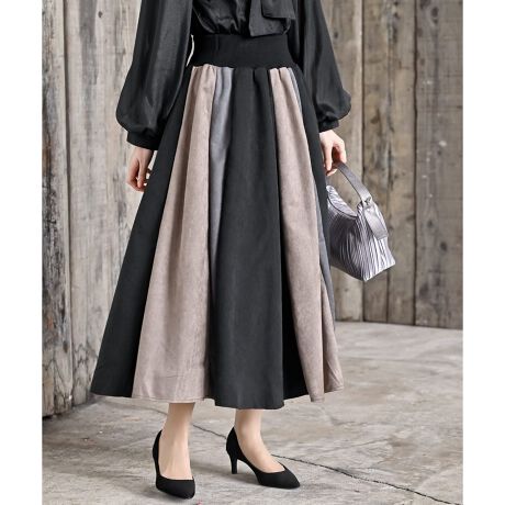 ピーチ起毛とフェイクスウェードの異素材を12枚つないだフレアスカート。