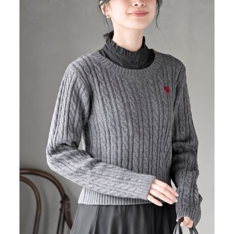 真っ赤なハートが可愛いケーブルニット
