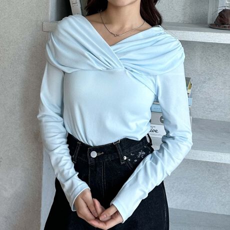 肩部分にたっぷりと寄せたギャザーでデコルテの開き具合を調節出来ます。