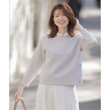 左脇の裾に、J.PRESSロゴ刻印の入ったオリジナルメタル釦を使用したカットソー。少し大き目のボタンと、ツルっとした表地でカジュアルに見えすぎないのがポイント。サイズ感も大きすぎない、コンパクトでシンプルなシルエットにしており、スウェットライクな形でもきれいめに見える1枚です。