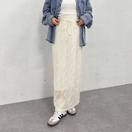 カット素材でカジュアル見えも叶うレーススカートなので、