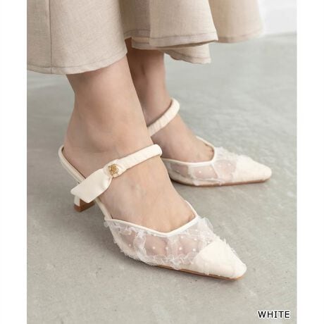 甲のストラップのスカーフ巻きデザインがエレガントな印象のミュールパンプス。