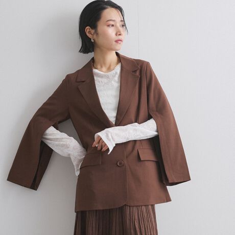 オーセンティックなシングルテーラードジャケットも袖のスリットデザインでトレンド感をプラス。