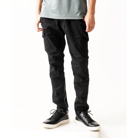 細身のシルエットですが、膝部分のタックデザインや裾のファスナー仕様で、