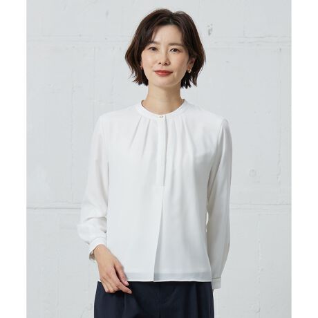 程よい透けと光沢感のある素材の、メタル釦がアクセントのカットソー。前立ての端に配色の生地を挟みこみ、シンプルな形ながらデザイン性をプラスしています。身頃はブラウス素材とジャージの2枚重ねのため、透けを気にせず、トレンド性のあるシアー感は感じられる1枚です。きちんと感のある普段使いしやすいデザインで、オフィスシーンからお出かけシーンまで幅広い場面で活躍します。
