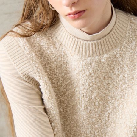 Tシャツやブラウスに重ねるだけでぐっとお洒落に見えるもこもこ感が可愛いニットベスト。可愛いだけでなくニットであたたか。秋冬のマストアイテムになりそう。