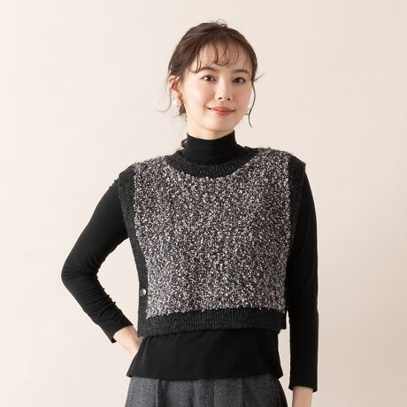 二色使いのパイル糸を使用した暖かみのあるニットベスト。毛足の長いループヤーンが可愛らしく癒される表面感。短めの着丈でレイヤードにお勧めのアイテム。小柄さんにもバランスが取りやすい丈でボレロ感覚で着用ができます。両サイドは釦がついており、ボタンを開けると着脱もしやすくなっています。