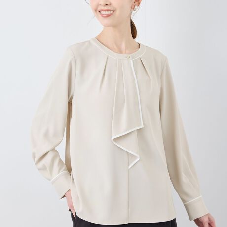 ・ラッフルでボウタイを表現した、エレガントな長袖プルオーバーブラウス。