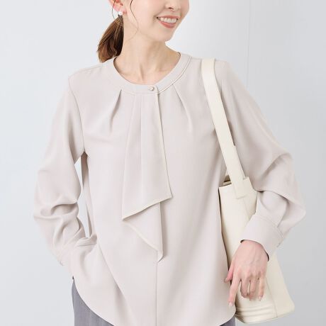 ・ラッフルでボウタイを表現した、エレガントな長袖プルオーバーブラウス。