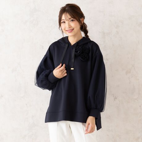 オーバーサイズのゆったりシルエットに巻きバラコサージュがおとな可愛いフード付きパーカー。