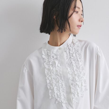 ネック部分からバスト下まで配置された、程よく着映えするミニフリルデザインのブラウスです。
