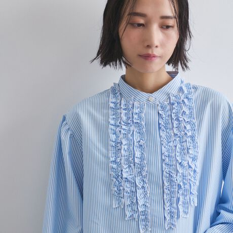 ネック部分からバスト下まで配置された、程よく着映えするミニフリルデザインのブラウスです。