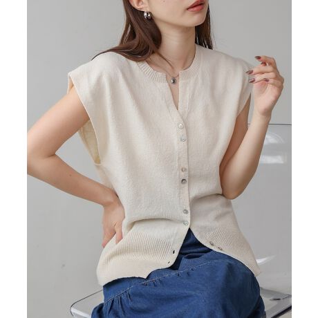 フレンチスリーブとキーネックで大人の抜け感を演出するライトなニットベスト!ミックスヤーンの上品なルックスが視線を集めます。裾はリブ編みに編み替え、幅を広く取ることで下半身の華奢見せに。2個ずつ連なったシェルボタンがさり気なくアクセントになり 繊細な輝きを放ちます。締め付け感の無い着心地ながら美しいシルエットにこだわった1枚です。