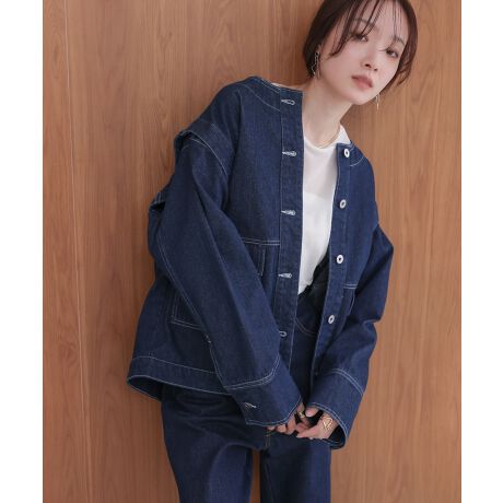 春先にもぴったりなデニムジャケットが、ベストでもお召し頂ける2WAY仕様で登場!直線的なシルエットと計算しつくされたサイジングで、ビッグシルエットに寄り過ぎず キレイめ好きさんにも手に取りやすい1枚になりました。ウエスト切替とフラップポケットは腰高に見せてスタイルアップ効果を発揮し、襟元はシンプルなノーカラーでクリーンな印象に。取り入れるだけで大人のこなれカジュアルな着こなしを楽しめます。