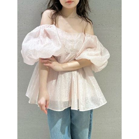毎シーズン大人気のペプラムビスチェが、春らしいデザインで再登場。女性らしいボリューム感と程よい肌見せデザインはそのままに、シアー素材を取り入れることで軽やかで季節感のある印象に仕上げました。ボタンで簡単に取り外しができ、パフスリーブ、オフショルダー、キャミソールと3Wayの着こなしが楽しめます。肩紐は長さ調節が可能で、上身頃はシャーリング仕様のためフィット感が高く快適に着用いただけます。